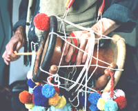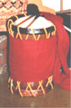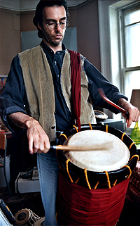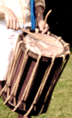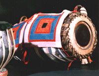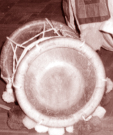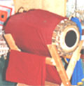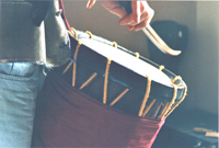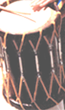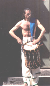 La diffusion des percussions du kathakali et de leur musique est un des buts que poursuit le Centre de création pour musique et danse où Bruno Paquet a mis sur pied l'Ensemble Mahapooram.![]() Port de l'edakka ![]() L'habillage du chenda cache les tenseurs